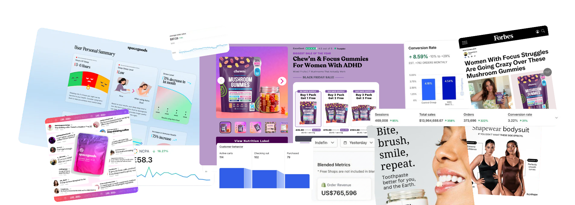 Full funnel builds, offer strategy, daily media buying, and creatives. We take you from platform-dependent to profitable DTC machine on Shopify + Paid ads.
